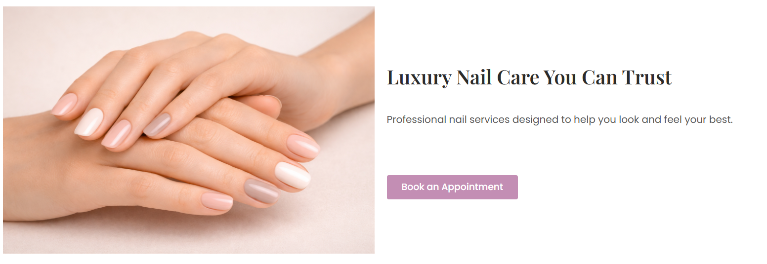 Our goal is simple: beautiful nails, clean technique, and a relaxing experience from start to finish. This demo layout highlights a modern, feminine aesthetic with clear services, strong calls to action, and mobile-first design.
